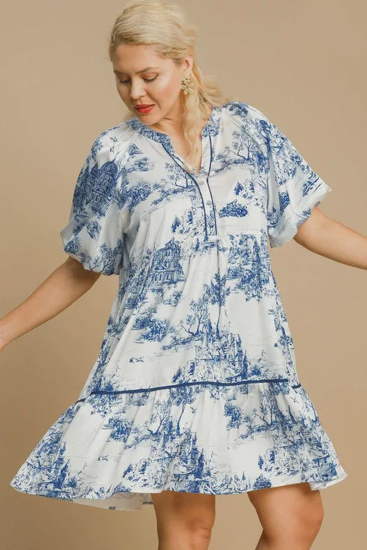 Umgee Dark Blue Two Tone Landscape Print Dress