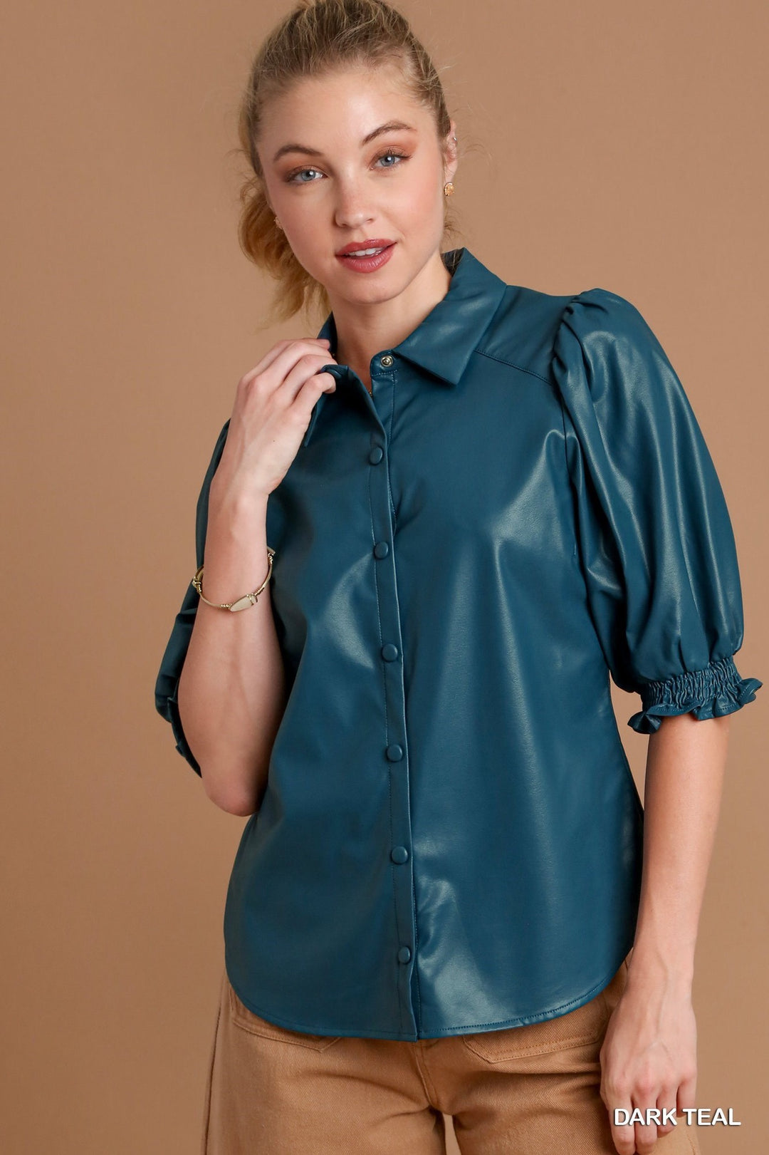 Umgee Dark Teal Puff Sleeve Faux Leather Blouse