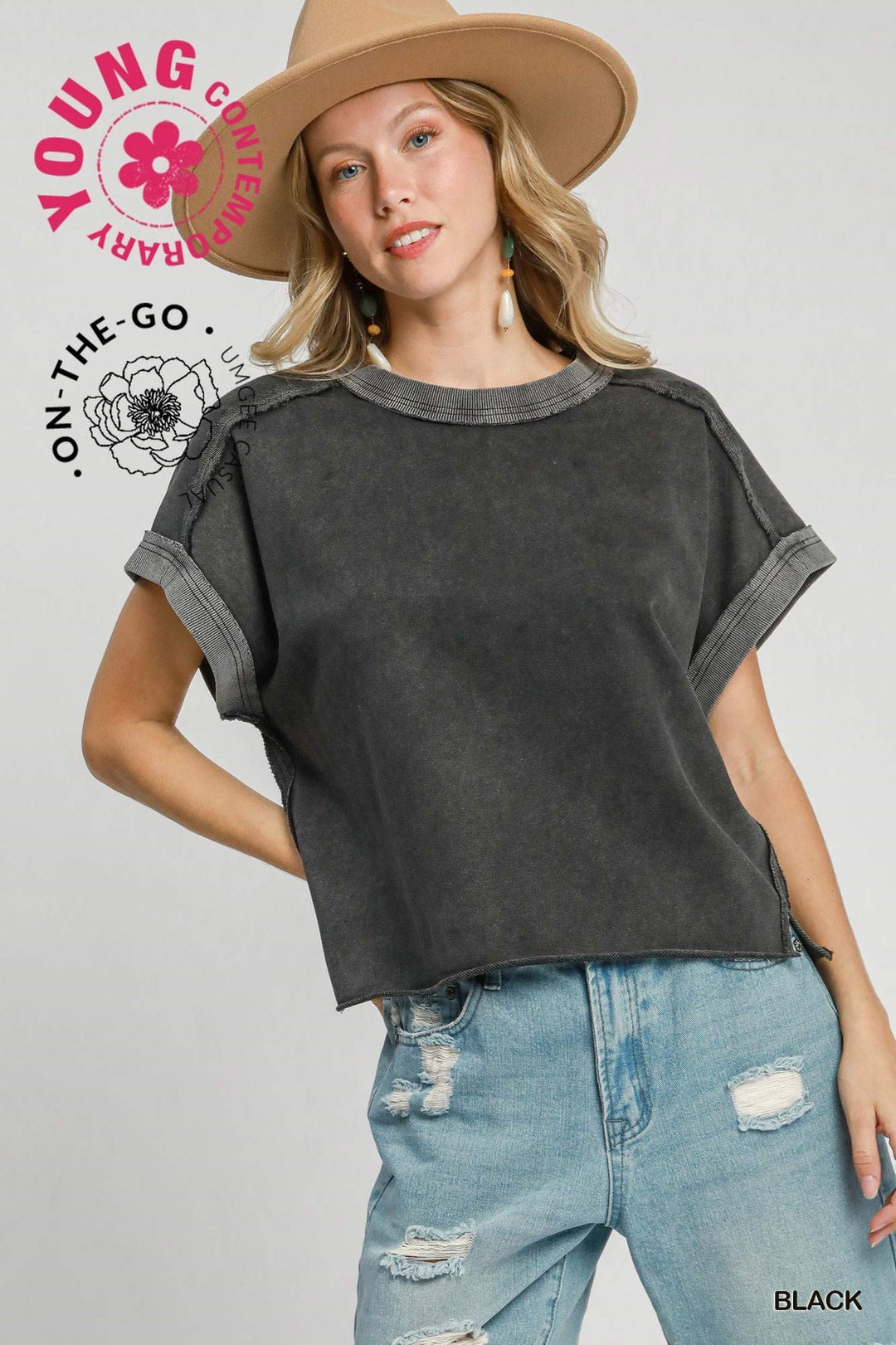 Umgee Black Mineral Washed Dolman Sleeved Crop Top
