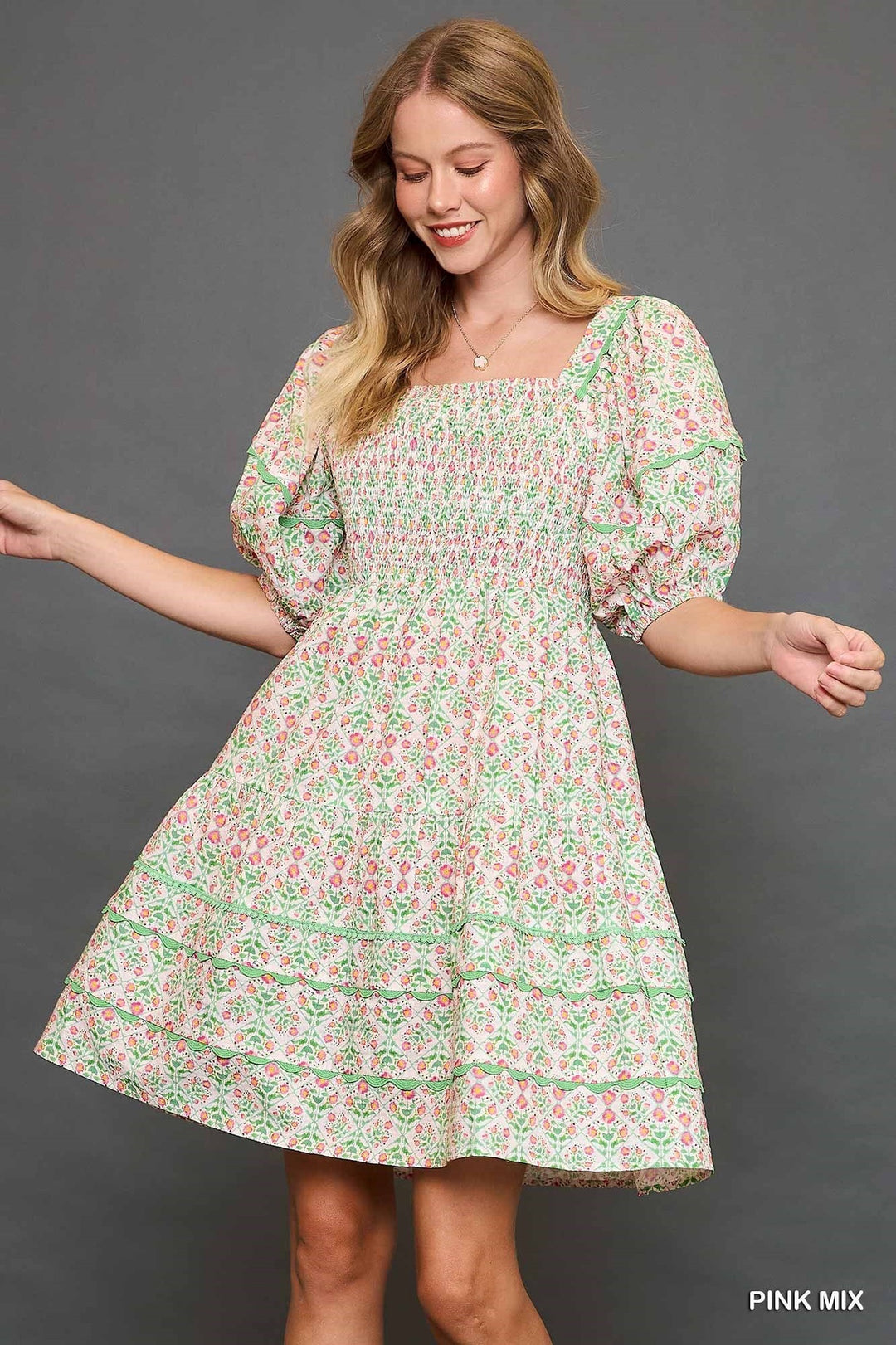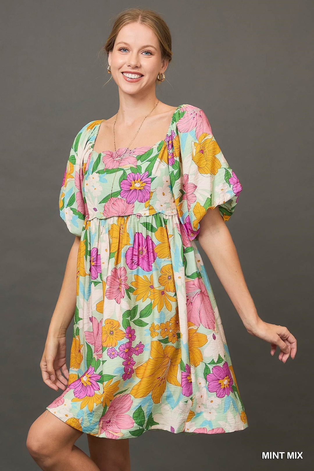 Umgee Pink Mix Floral Print Mini Dress with Puff Sleeves