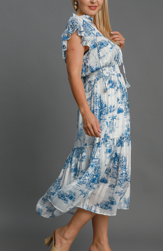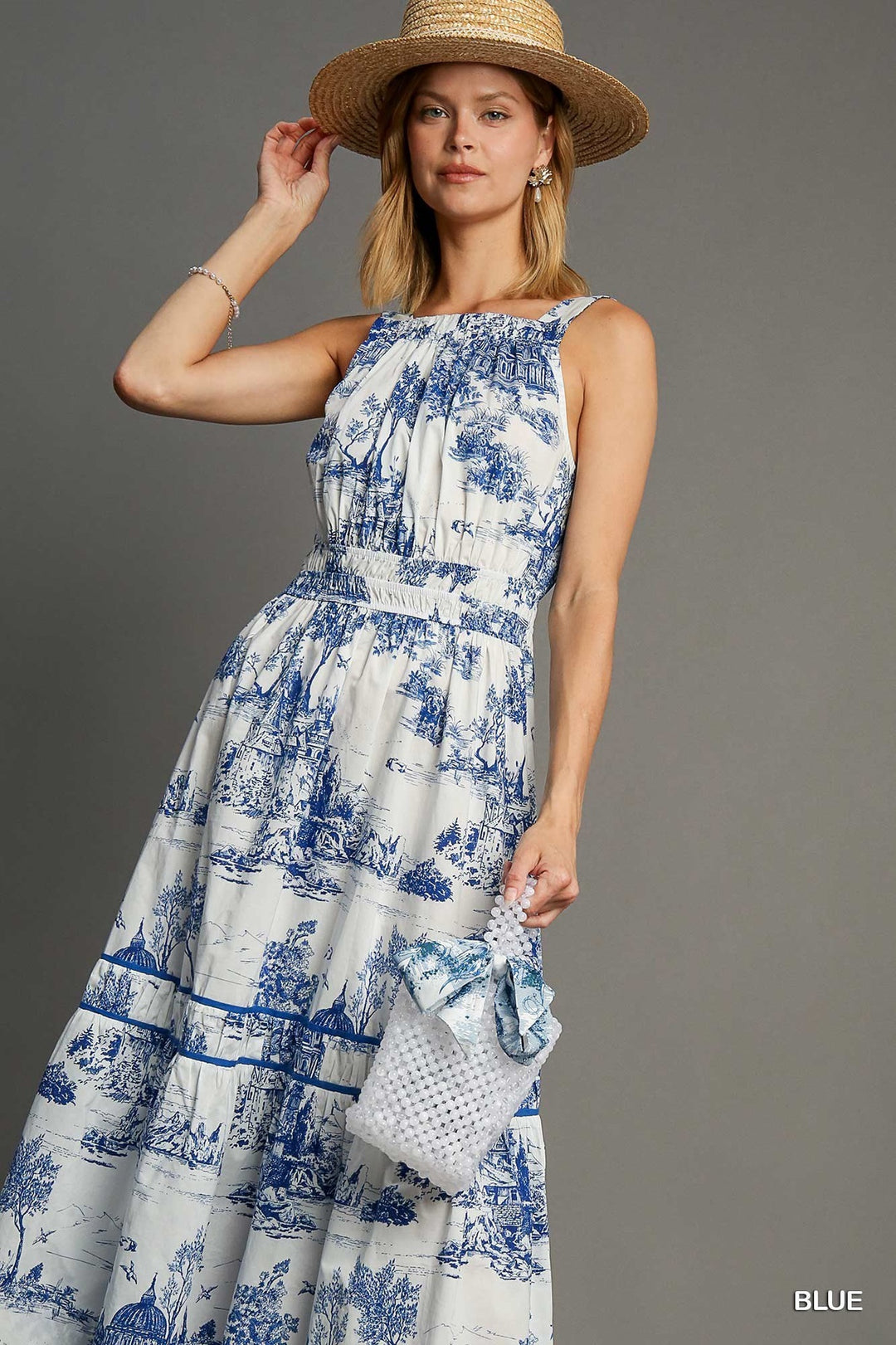 Umgee Blue Mix Two Tone Landscape Print Midi Dress