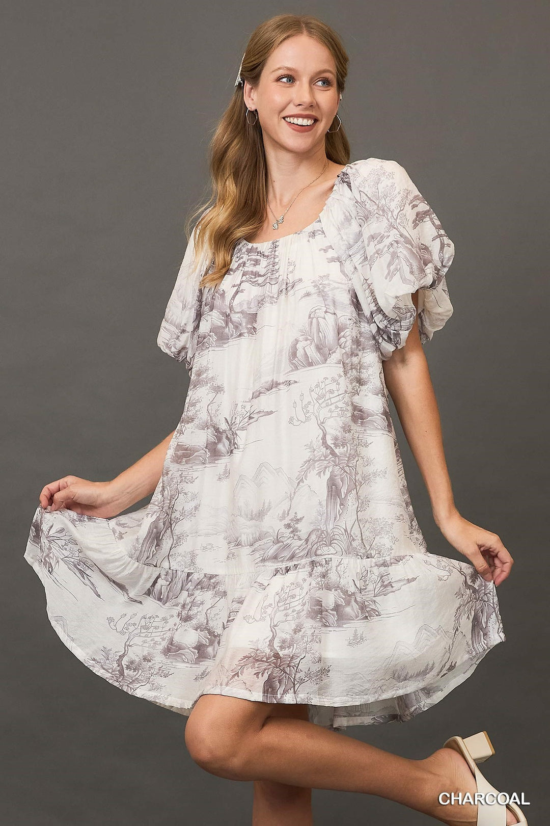 Umgee Charcoal Toile Print Dress with Puff Sleeves