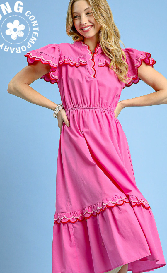 Umgee Scalloped Trim Flutter Sleeve Midi Dress- Pink