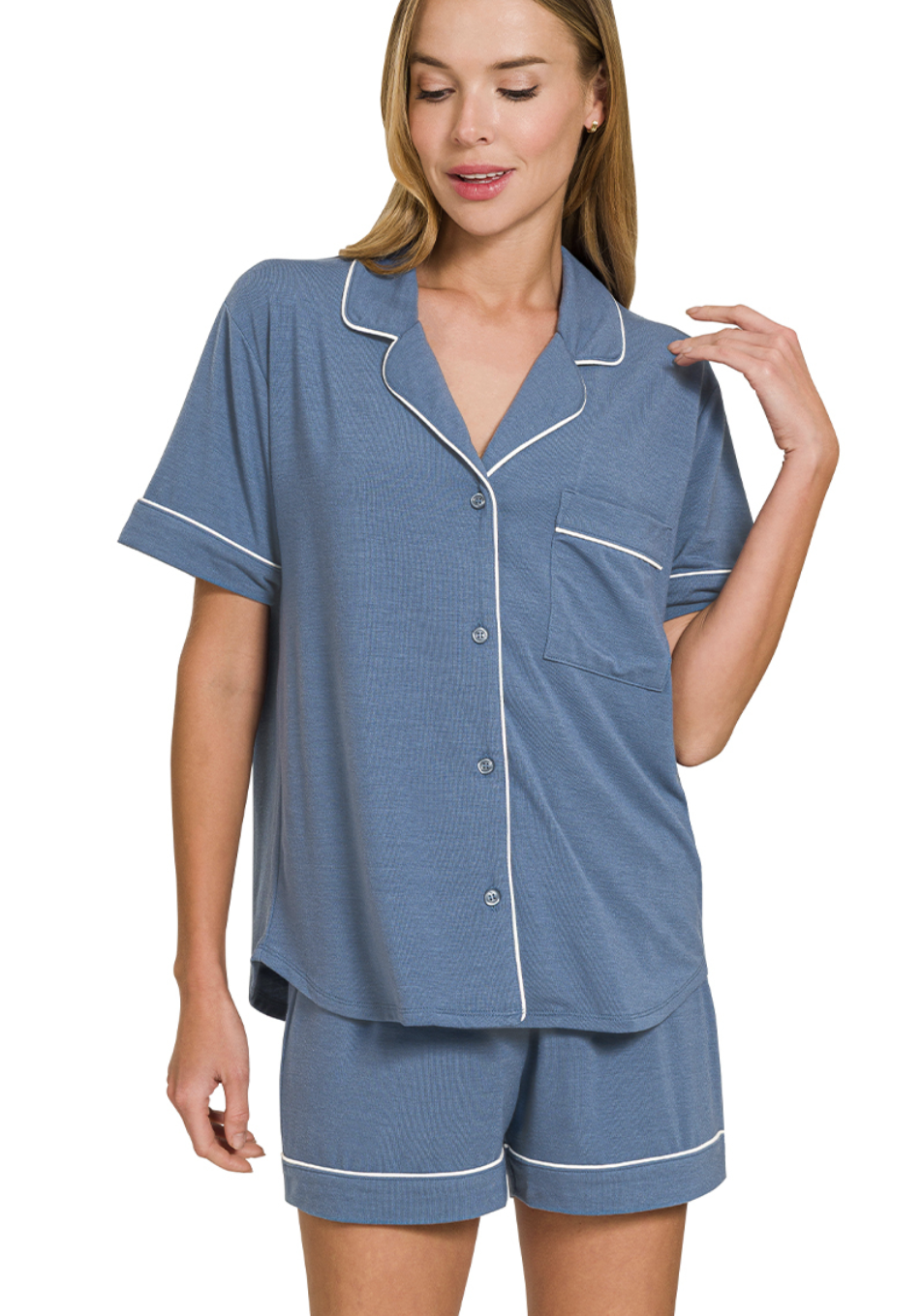 Zenana Dusty Blue Short Sleeve Button Down Lounge Set