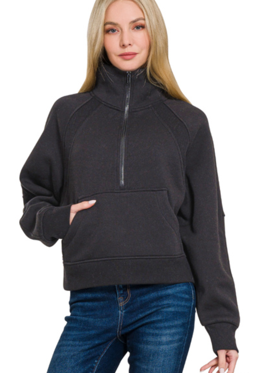 Zenana Fleece Half Zip Kangaroo Pocket Sweatshirts Black