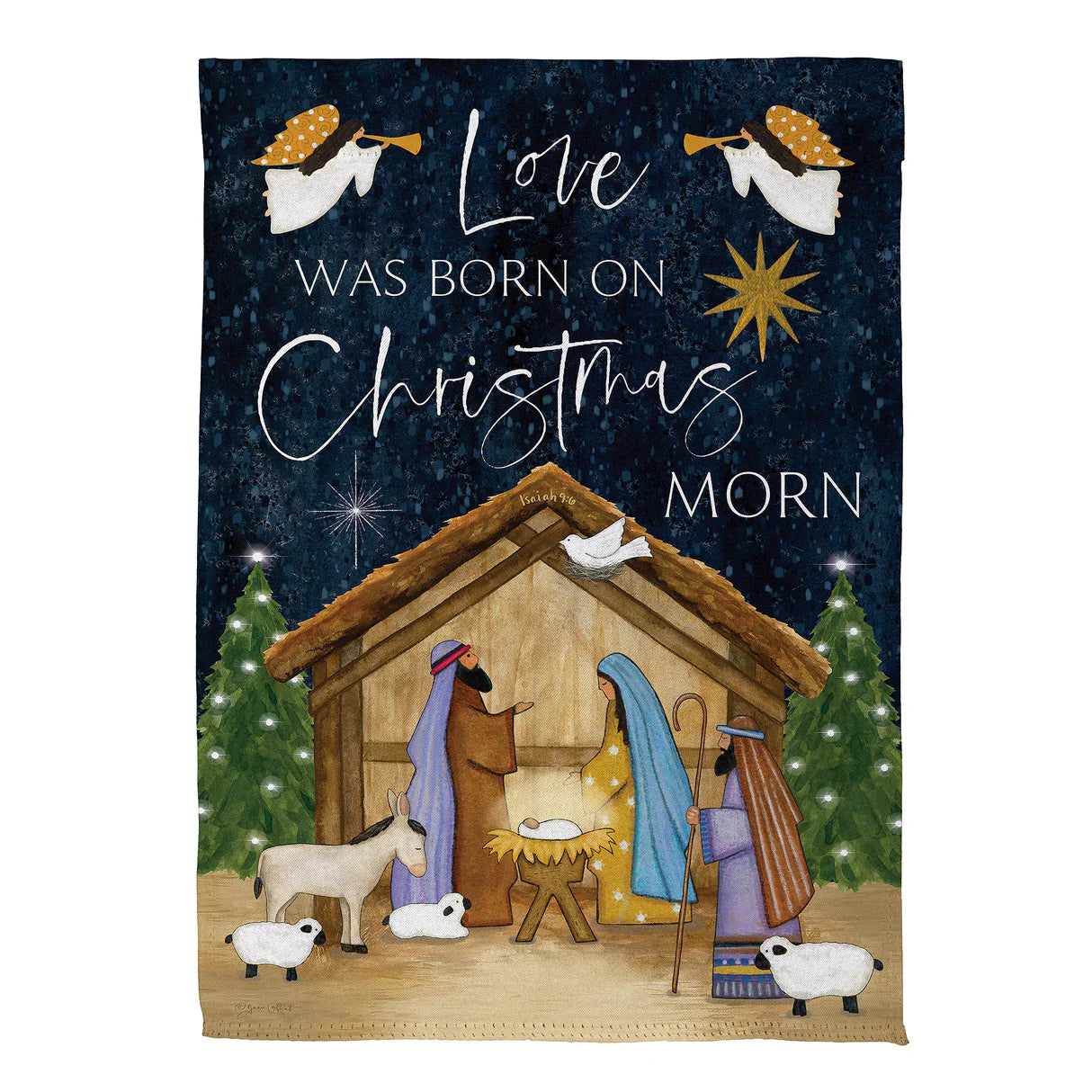Add magic and wonder to any garden or yard when you hang up this beautiful flag. Featuring a heartwarming nativity scene, this flag is perfect for the festive season. Flag is crafted of medium-weight suede fabric made from recycled plastic that provides a soft and durable texture. Artwork is heat transferred onto the sun-blocking material so that it is easily viewed from both sides. The weatherproof flag will not fray or fade with continued outdoor use. This flag features a sleeve for use with any standard flagpole or stand, sold separately.