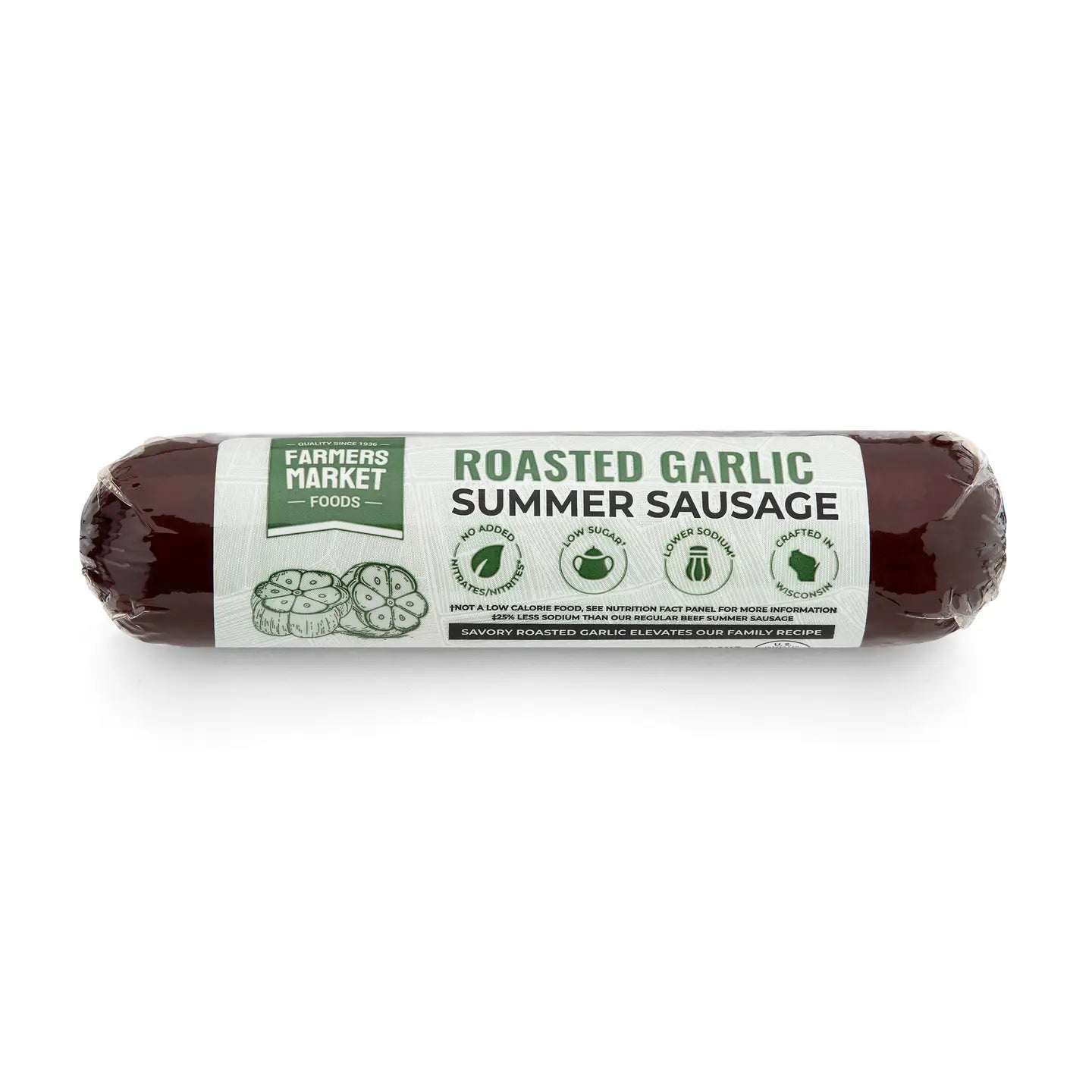 Naturally cured, hardwood smoked all-natural summer sausage with no added nitrates/nitrates or MSG, low sugar, lower sodium, gluten free, keto- and paleo- friendly. From our family’s farm to your table, Farmers Market Foods Roasted Garlic Summer Sausage delivers bold, rustic flavor. Made with real roasted garlic and whole spices, it’s slow-smoked in small batches and free from artificial preservatives, nitrates, nitrites, or fillers, a wholesome, flavorful choice for those who value food with roots.